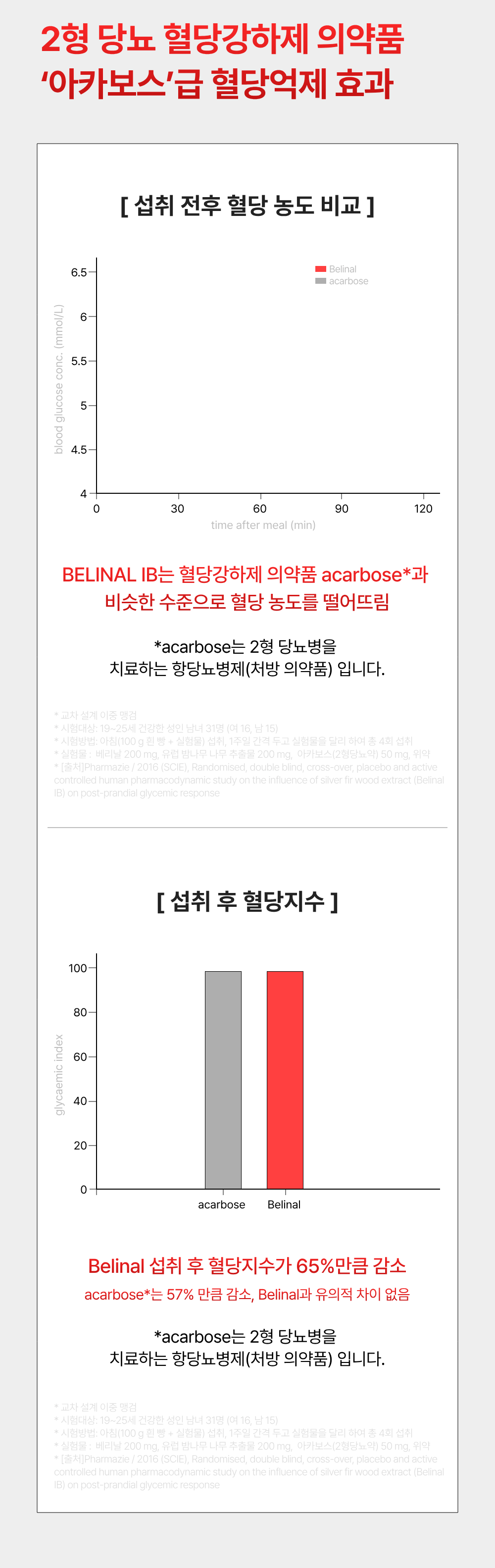 베리날은 제 2형 당뇨병에 의약품으로 처방 되는 아카보스(acarbose) 를 비교군으로 포함한 인체 임상 결과 혈당 상승치 65%의 엄청난 억제력과 혈당 커팅력을 보여주었어요!