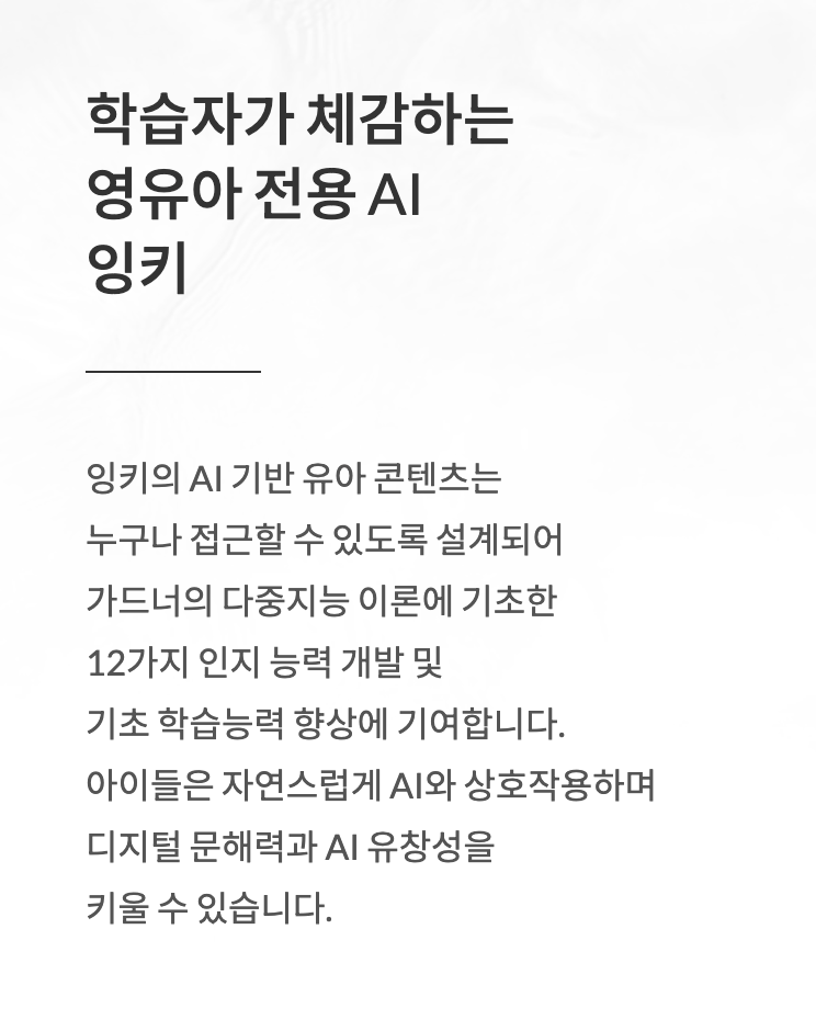 잉키의 AI 기반 유아 콘텐츠는 누구나 접근할 수 있도록 설계되어 가드너의 다중지능이론에 기초한 12가지 인지능력 개발 및 기초 학습능력에 기여합니다.