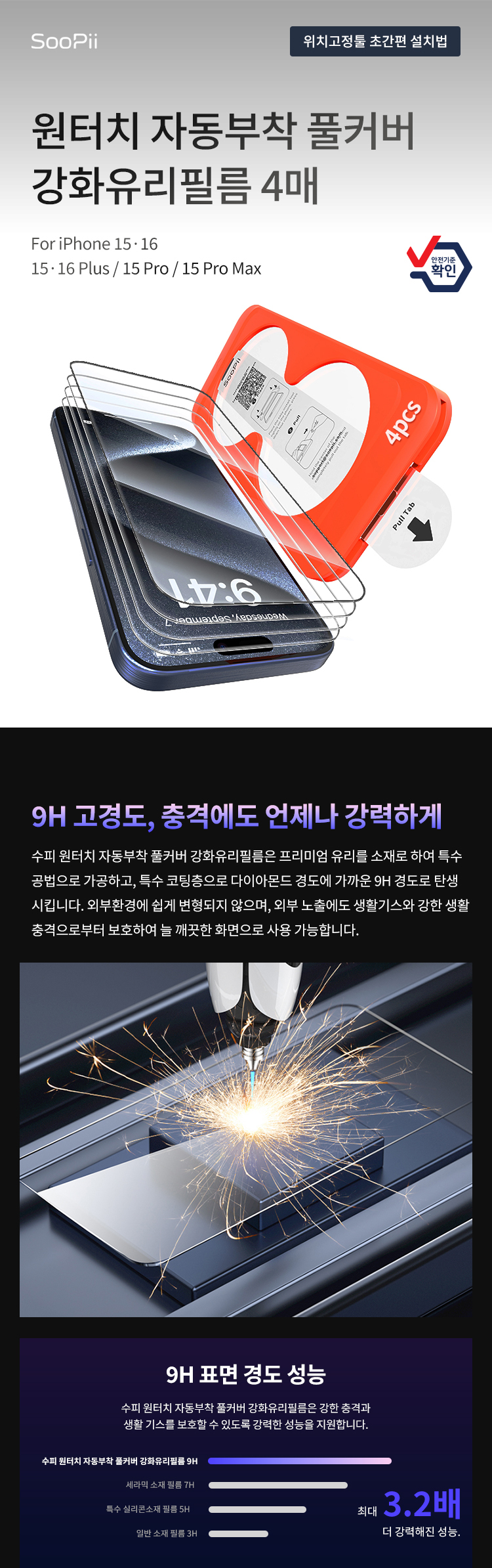 원터치 자동부착 풀커버 강화유리필름 4매입 (아이폰 기종 잘 확인해주세요!)