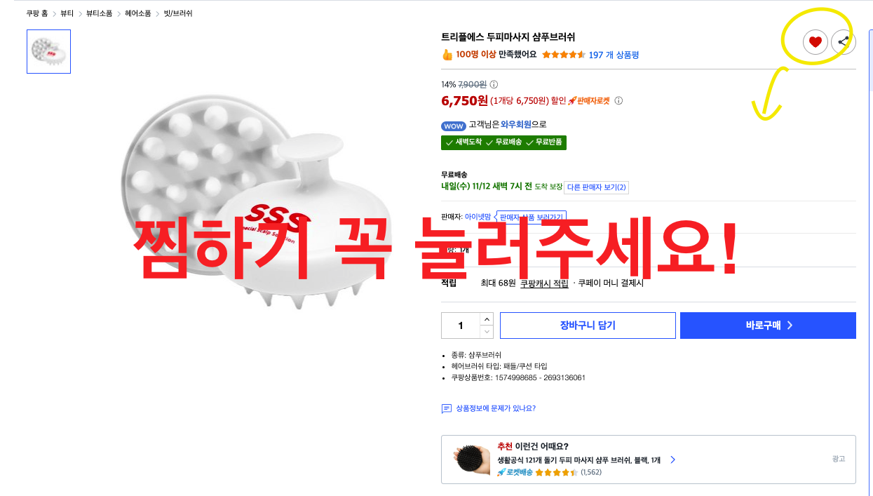 20명 모집쿠폰 적용결제 지원금 7,000 P두피브러쉬 1개 (판매자 - 아이넷맘 확인필요) [배송비 포함 6,750원]