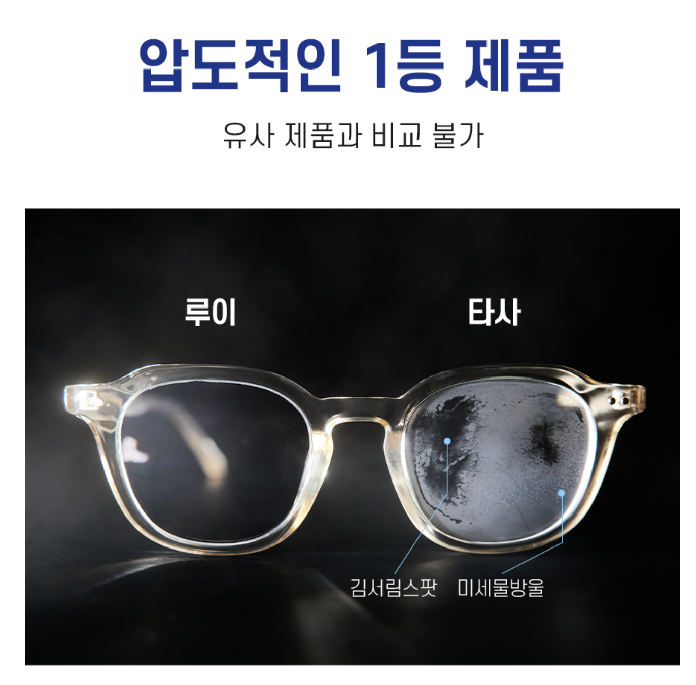 (필수: 물기 없는 깨끗한 안경/렌즈 등에 루이를 코팅하는 모습, 코팅 전/후 김서림효과 비교 모습)