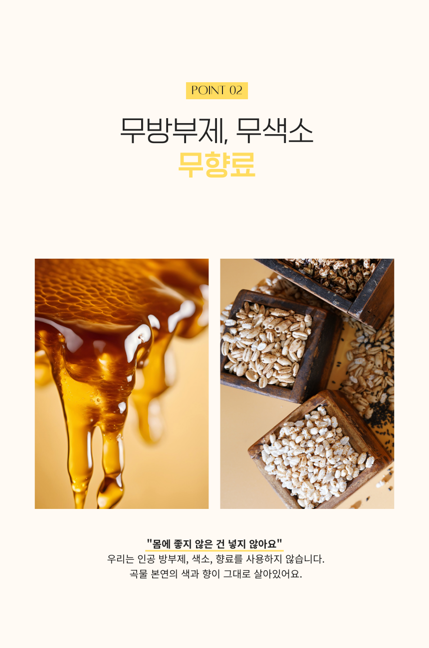 수제한과라는점과 30 년 전통방앗간에서 생산했다는 점 그리고 설탕추가로 넣지 않아 곡물과 견과류의 맛을 최대로 살렌점을 강조 부탁 합니다.