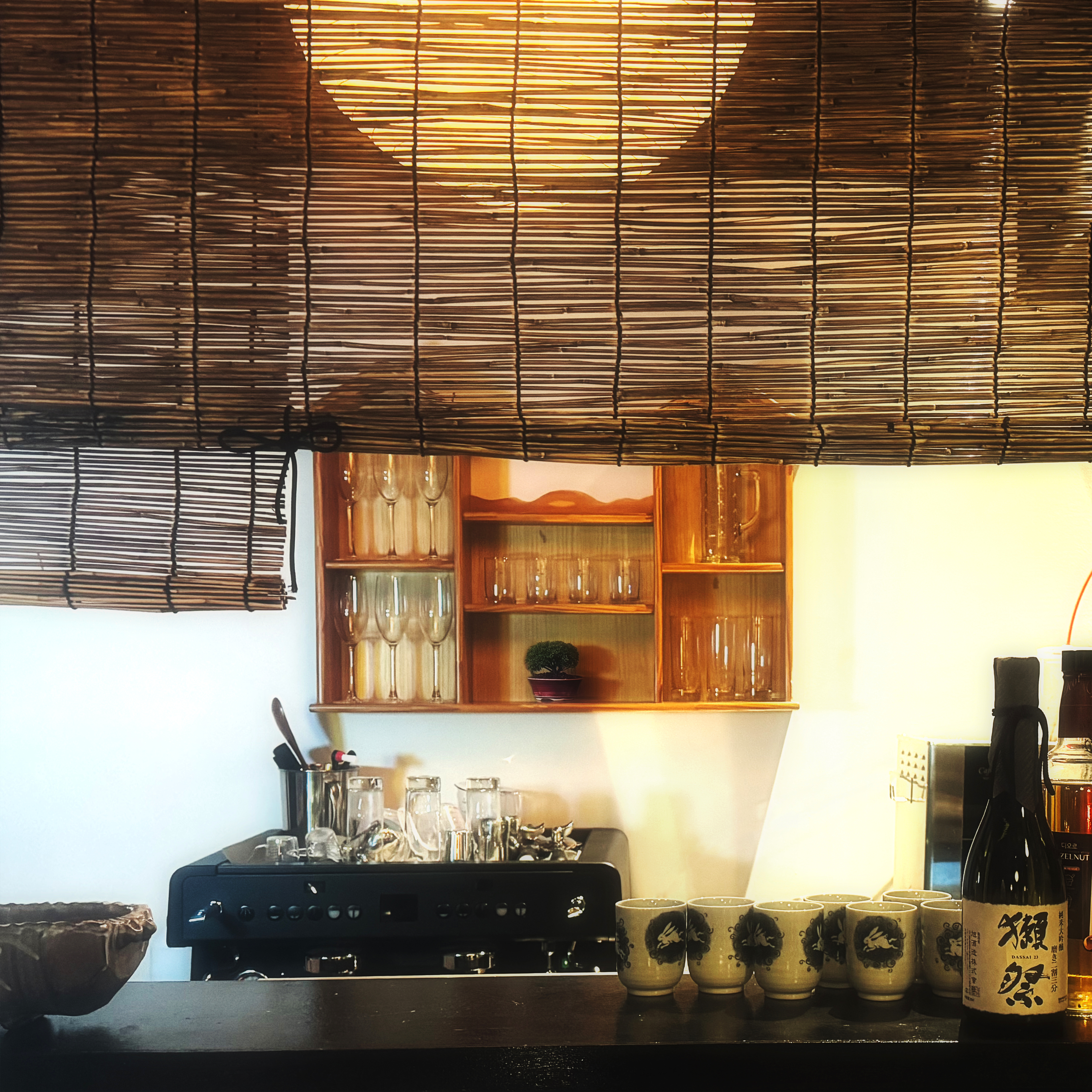 매장 인테리어와 음식이 조화로운 구성, 먹음직스러운 음식 클로즈업, 따뜻하고 감성적인 톤의 필터
