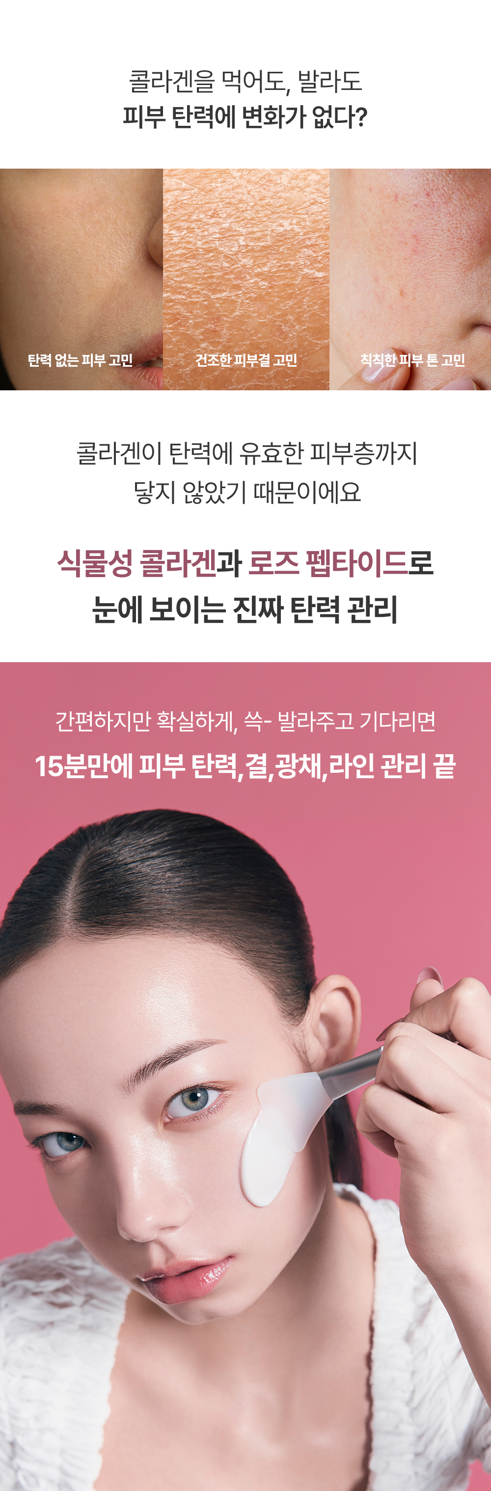 - "콜라겐을 먹어도, 발라도 탄력 변화가 없던 이유" 등의 고민 제시