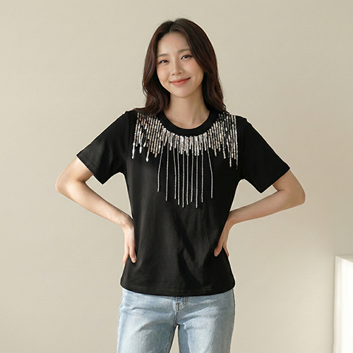 데일로엔 여성 여름 스팽글 큐빅 체인 포인트 데일리 반팔 티셔츠