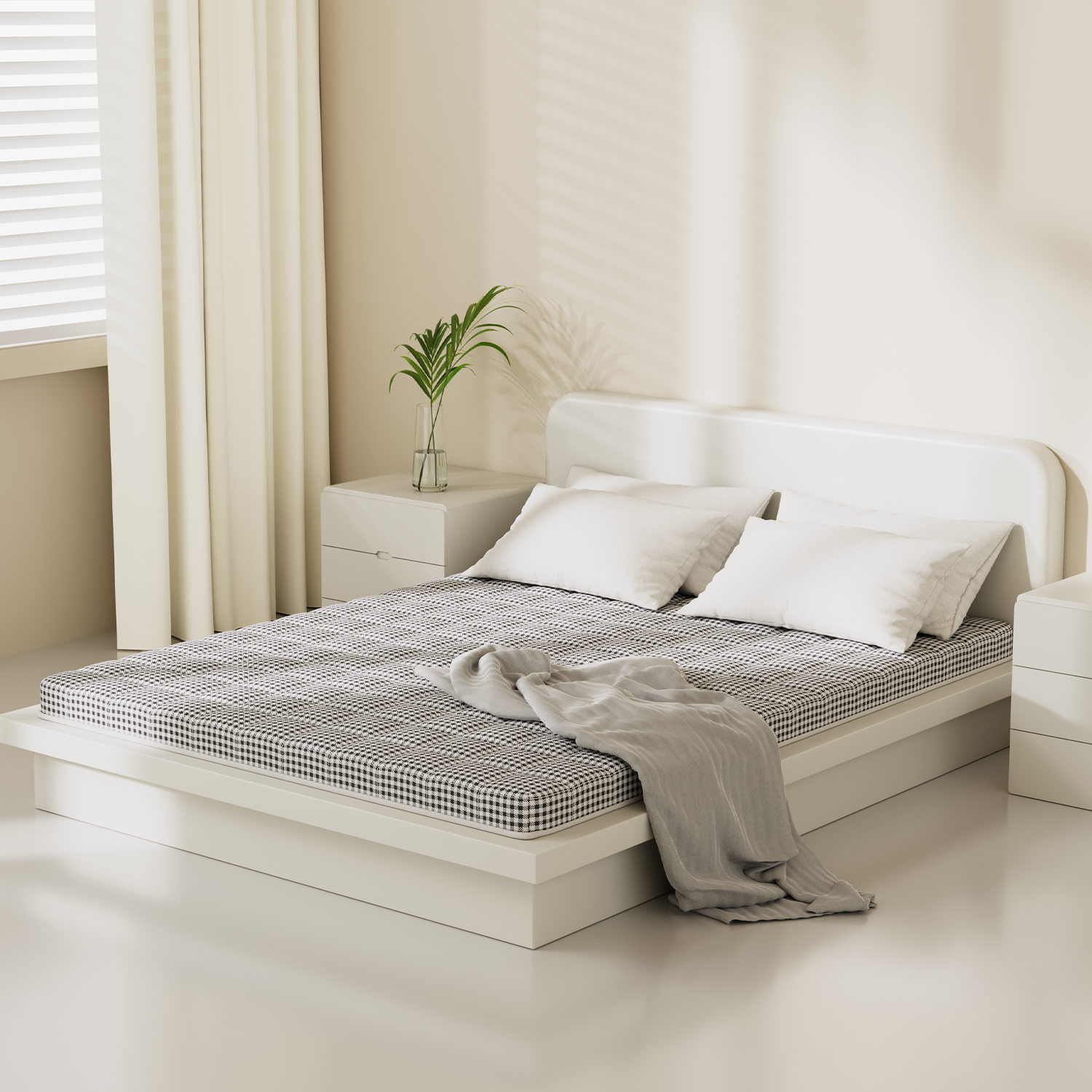 침대 위 혹인 바닥에 메모리폼 매트리스를 펼친 전체 모습 (깔끔하고 밝은 분위기)