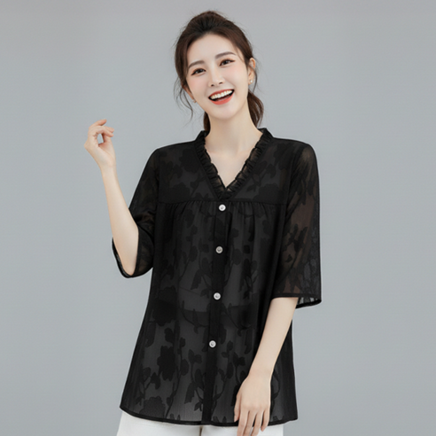 여성 여름 레이스 블라우스 셔츠 루즈핏 플라워패턴 시스루 반팔