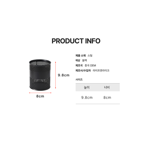 * 어디에나 잘 어울리는 심플한 블랙 색상의 연필꽂이,튼튼하고 견고한 스틸 소재라 잔고장이나 변형에 걱정이 없는,책상 위 필기구부터 화장대 위 다양한 메이크업 도구들이나 머리빗도 보관하기 좋은 ,겉이 메쉬망으로 되어있어 공기도 잘 통하고 먼지쌓임을 주여주는, 내용물 확인도 하기 좋은 ,부드러운 라운딩 마감으로 편안하고 안전한 강조 문구 반드시 포함