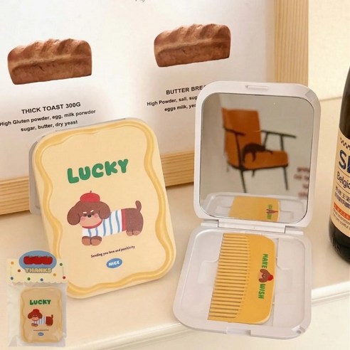 캠페인명 : 캐릭터빗 제품명 : 귀여운 캐릭터 빗 거울 휴대용 세트, 1개, 옐로우 강아지